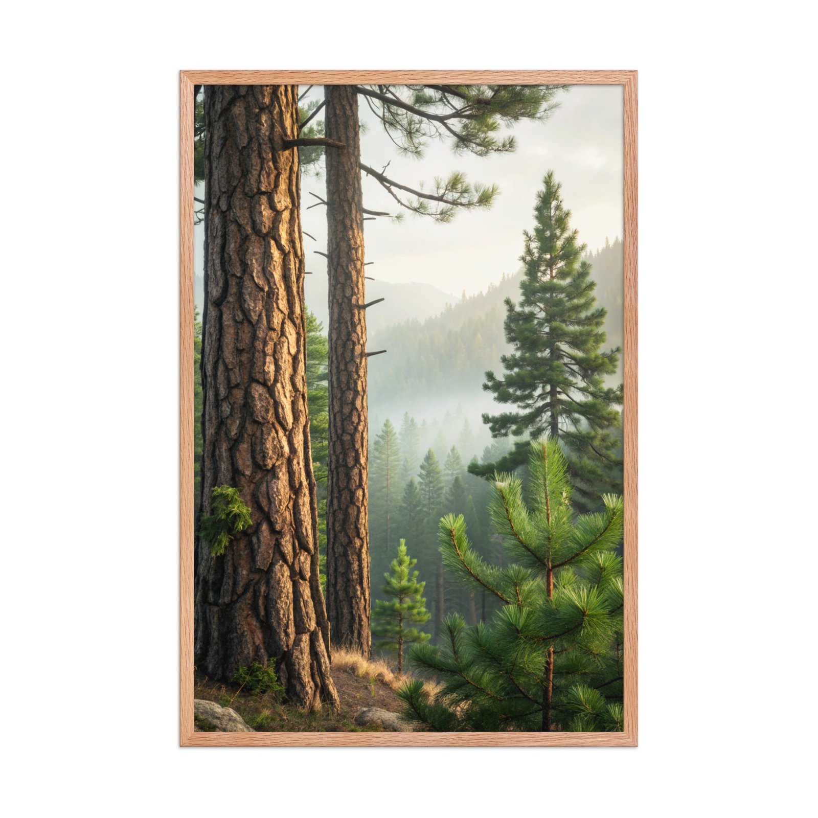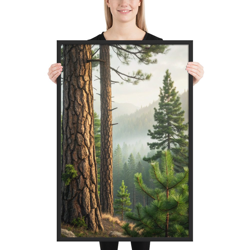 This poster features a breathtaking, vertical landscape composition of a serene woodland scene. The foreground is heavily anchored on the left by the massive, richly textured trunks of two mature pine trees, which are catching warm, golden-hour light. In the lower right, vibrant, detailed green pine needles from a younger tree provide a fresh pop of color. The background seamlessly transitions into a deep, majestic vista of an evergreen forest rolling over distant hills, beautifully softened by an ethereal, glowing morning mist. The overall mood is incredibly tranquil, grounding, and atmospheric.
