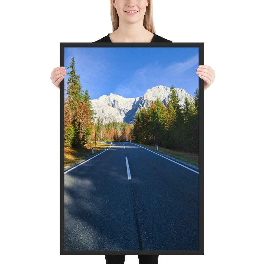 Elevate your interior design with The Alpine Ascent, a breathtaking piece of fine art that invites the grandeur of the great outdoors straight into your home. This stunning 24″ × 36″ premium matte print captures the serene, awe-inspiring beauty of an open road drawing you toward a sunlit mountain peak, framed perfectly by lush, autumn-kissed forests.