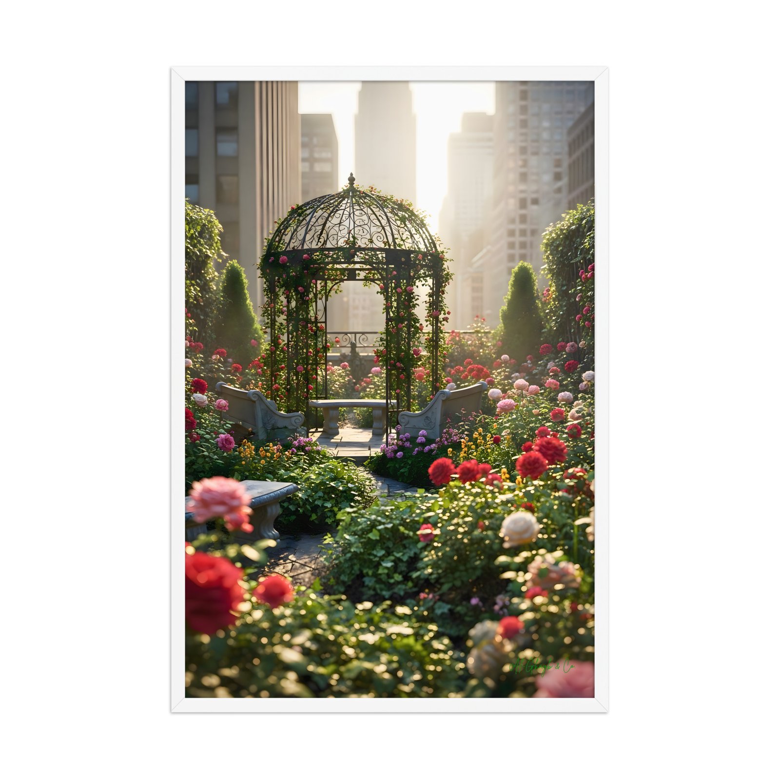 Discover an oasis of absolute refinement with “Urban Secret Garden.” This stunning 24″ × 36″ framed matte art print transports you to a private rooftop sanctuary where classical elegance meets the modern horizon. Featuring a masterfully rendered rose garden and a delicate iron gazebo bathed in golden city light, this piece serves as a luxurious focal point for the sophisticated collector. Printed on museum-grade matte paper for a rich, velvety finish, it brings the romance of a hidden garden into your high-end interior.
