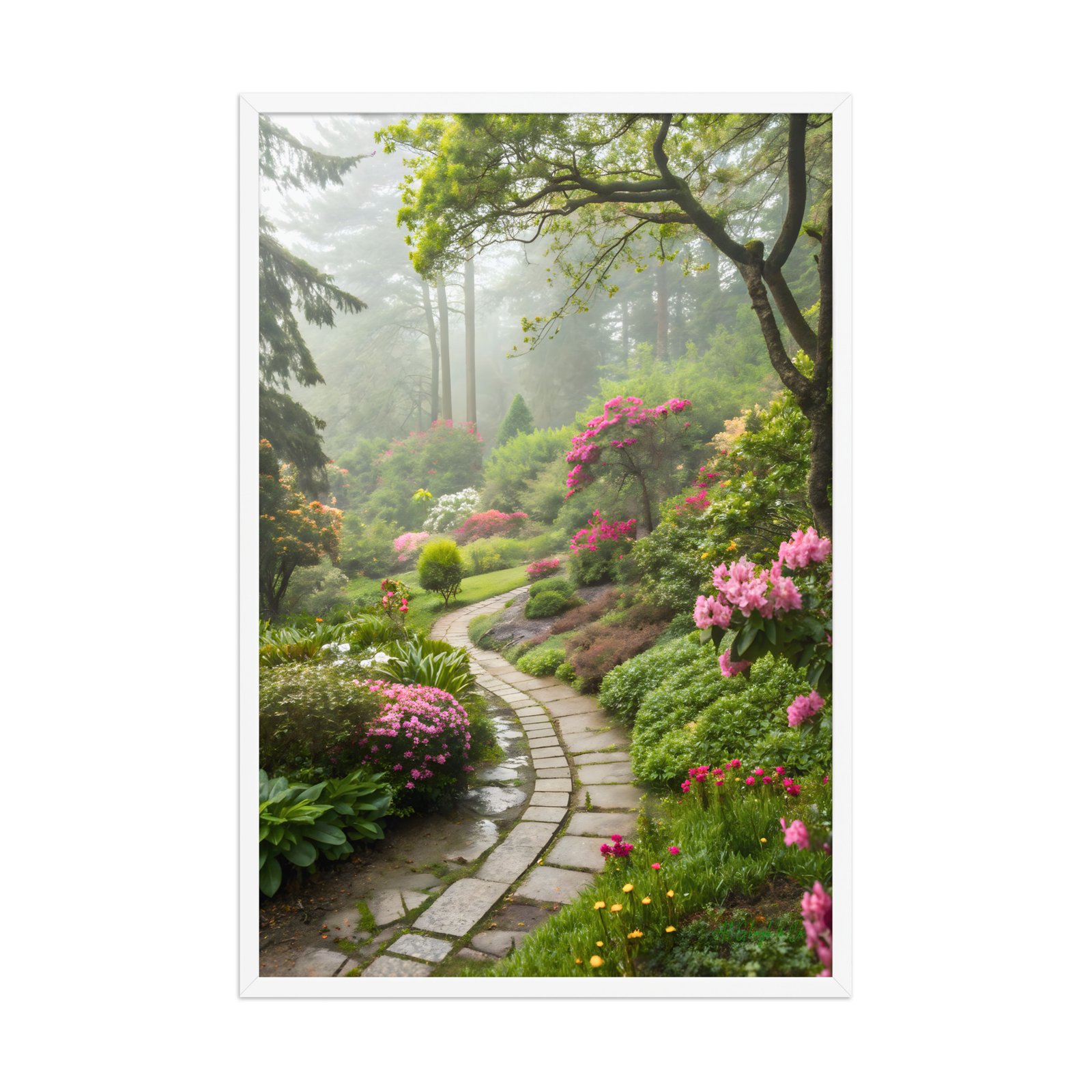 Step into a hidden sanctuary where nature unfolds in delicate harmony. Whispering Garden Path captures a winding stone walkway gently guiding you through a lush, mist-covered garden alive with vibrant blooms and soft greenery. Towering trees fade into a dreamy haze, while bursts of pink florals and manicured shrubs create a scene of quiet elegance and timeless beauty.