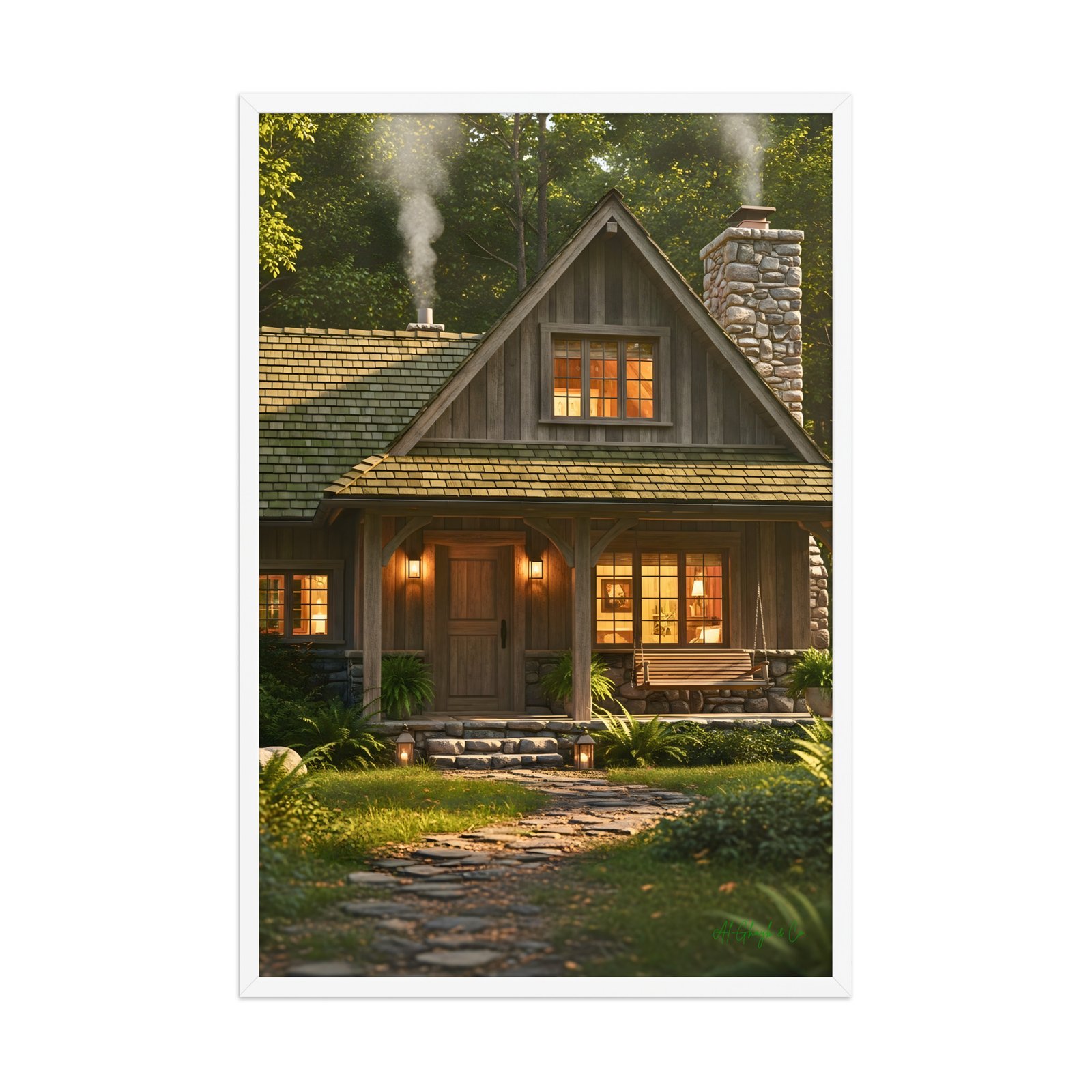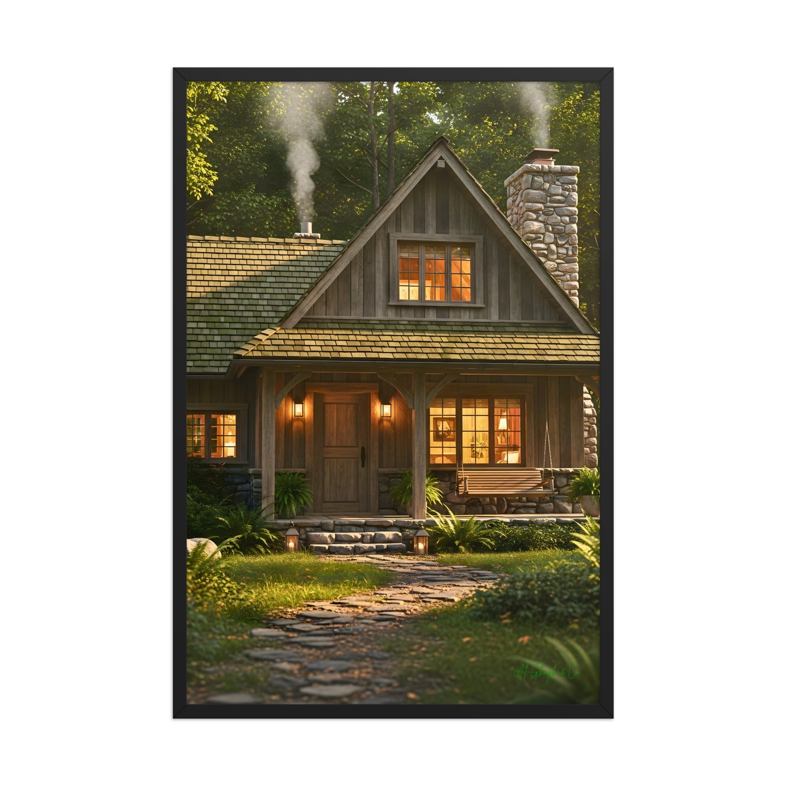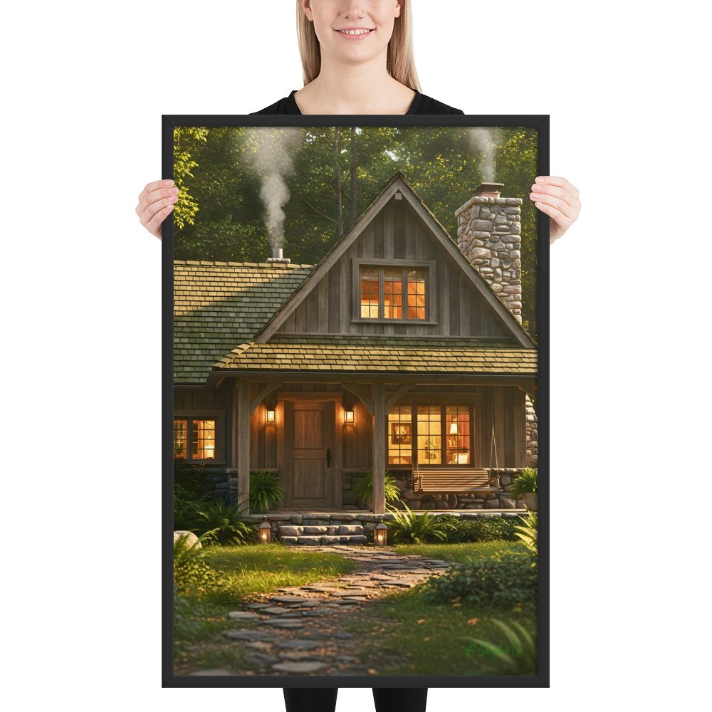 Retreat into a world of sophisticated comfort with “Woodland Cabin.” This exquisite 24″ × 36″ framed matte art print captures the soul-soothing essence of a luxury mountain hideaway. From the intricate stone textures to the inviting golden glow of the hearth, every detail is rendered to evoke a sense of warmth and exclusive serenity. Printed on museum-grade matte paper for a velvety, glare-free finish, this piece is a definitive statement in rustic elegance—perfect for elevating a den, library, or master suite.